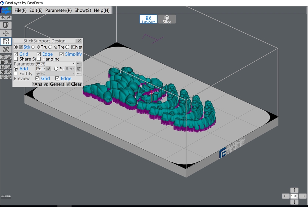 FastLayer 5分鐘一鍵排版牙冠;FastFab 一鍵啟動列印;全套軟體自主研發,永久免費。