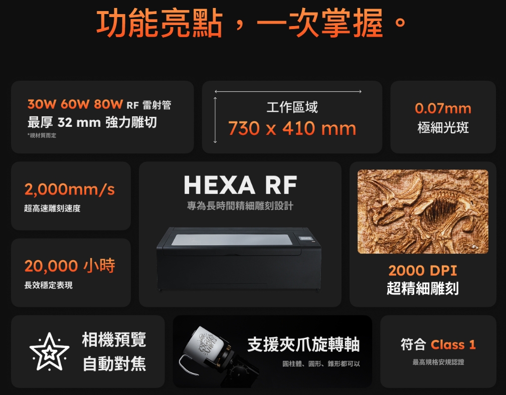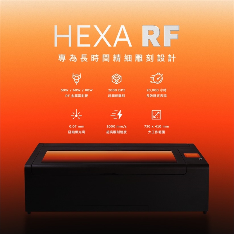 結合 2,000 DPI 超高解析與金屬 RF 雷射管,HEXA RF 將每一個細節都雕刻得清晰銳利。