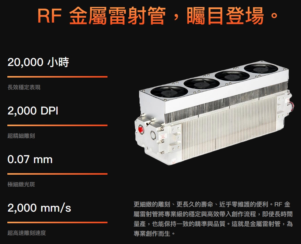 HEXA RF 搭載金屬 RF 雷射管,實現高達 2,000 mm/s 的雕刻速度。
