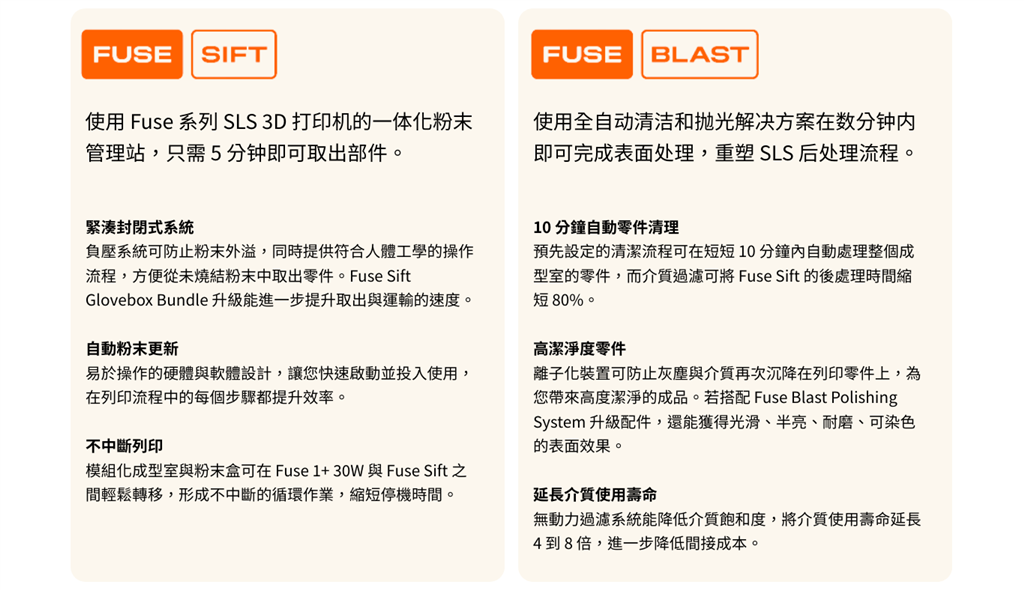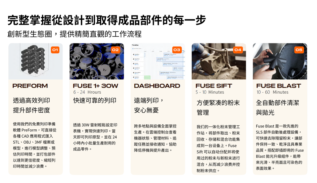 無論您需要當日獲得功能原型,還是每週生產數百個成品部件,Fuse 1+ 30W生態圈都能優化您的工作流程,實現更快速&經濟的工業級部件SLS 3D打印流程,並配合高效的自動化SLS後處理系統(Fuse Sift+Fuse Balst),實現更高的一致性、更短的週轉時間與更高的效率。
