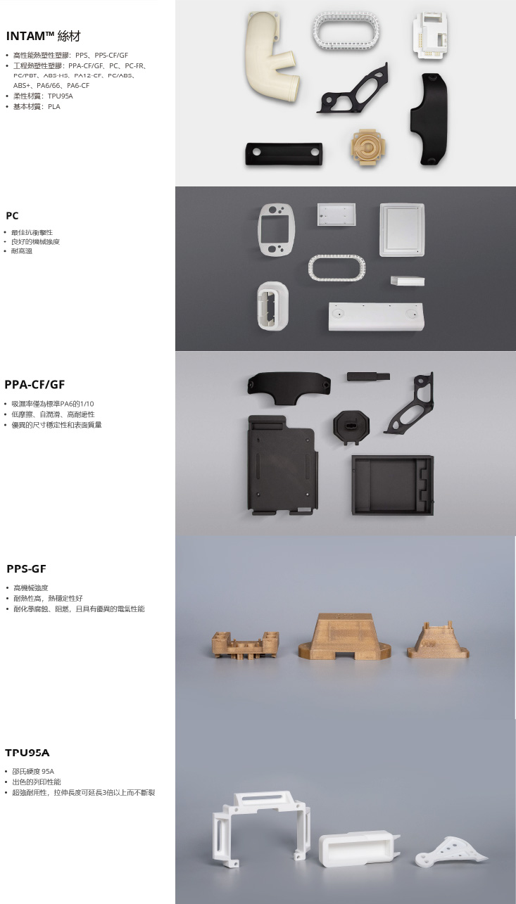 PC、ABS-HS、PPA-CF/GF、PA、PPS、PPS 及多種纖維複合材料與支撐材料 |