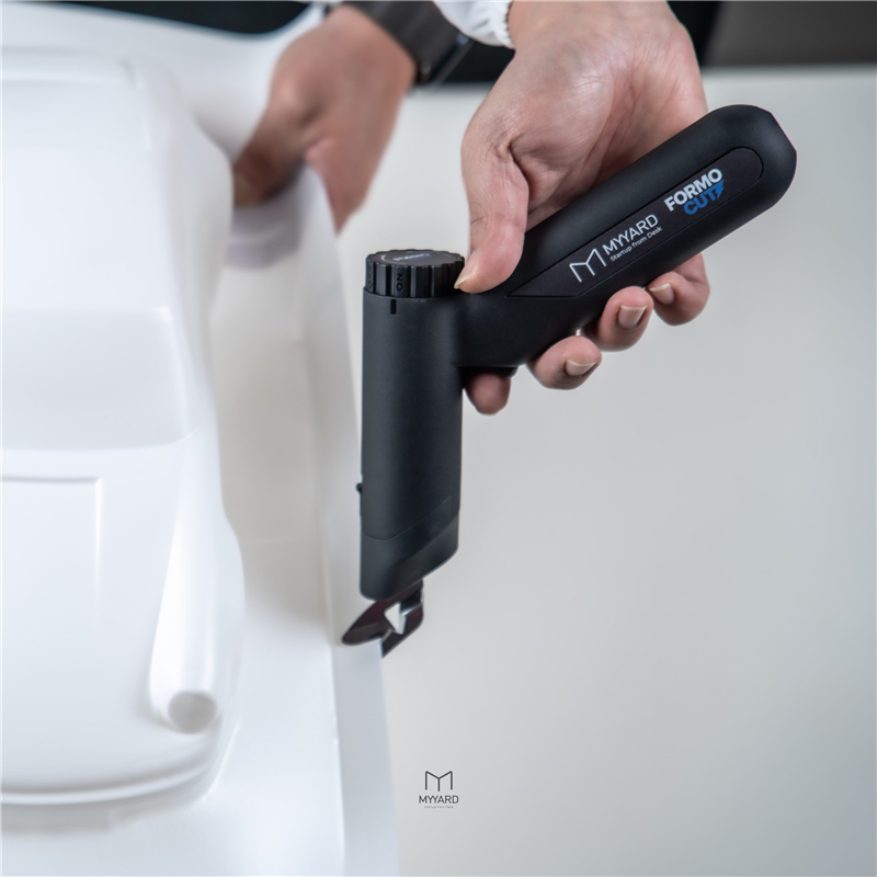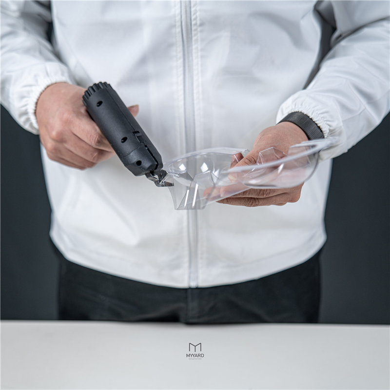 買過真空成型機的朋友,應該多少都碰過:成型很順,卻卡在「最後一刀」 雷切、超音波刀確實能切,但流程麻煩,還常伴隨惱人的燒塑膠味道。 一般市售電動剪刀多半為布料設計,握起來偏重,刀刃不適合剪泡殼,剪一段就開始鈍化、甚至毀損。 所以MYYARD跟老牌剪刀工廠合作開發 做出一款專門為 泡殼剪切設計 的電動剪刀