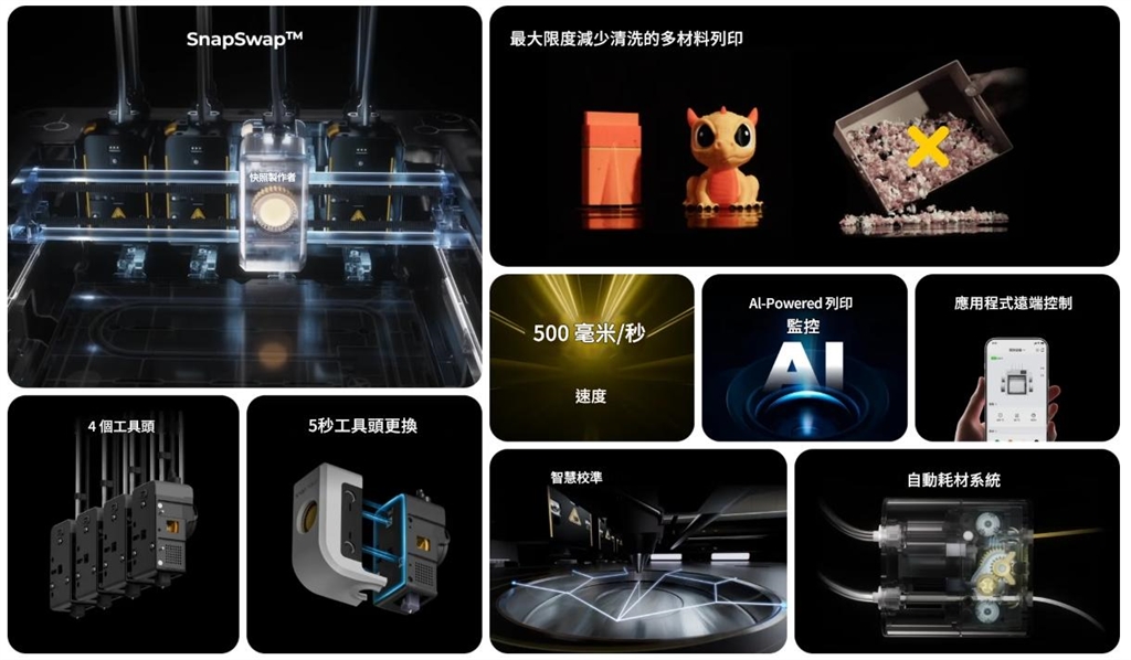 U1 列印機配備四個預先安裝並預熱了各自線材的列印頭,其SnapSwap™系統只需更換列印頭即可完成切換,將等待時間從大約兩分鐘縮短至僅五秒。