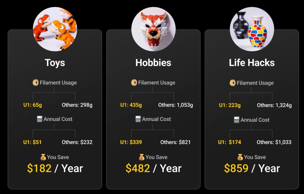 U1 列印機則不同。它只在新的列印作業開始前或流量校準期間清洗掉少量已降解的耗材,每次列印最多可減少 80% 的線材浪費。